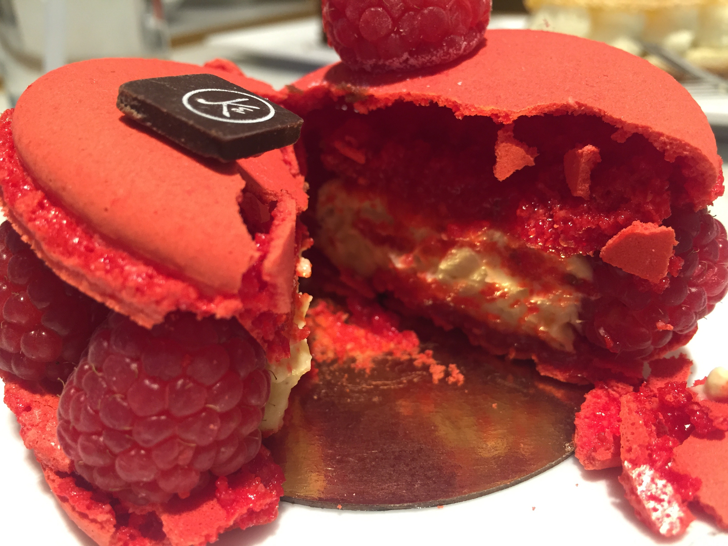 La especialidad de la casa, un macarron grande de frambuesa, relleno de crema de pistache y frambuesas frescas, le dan otro nivel al macarron común.