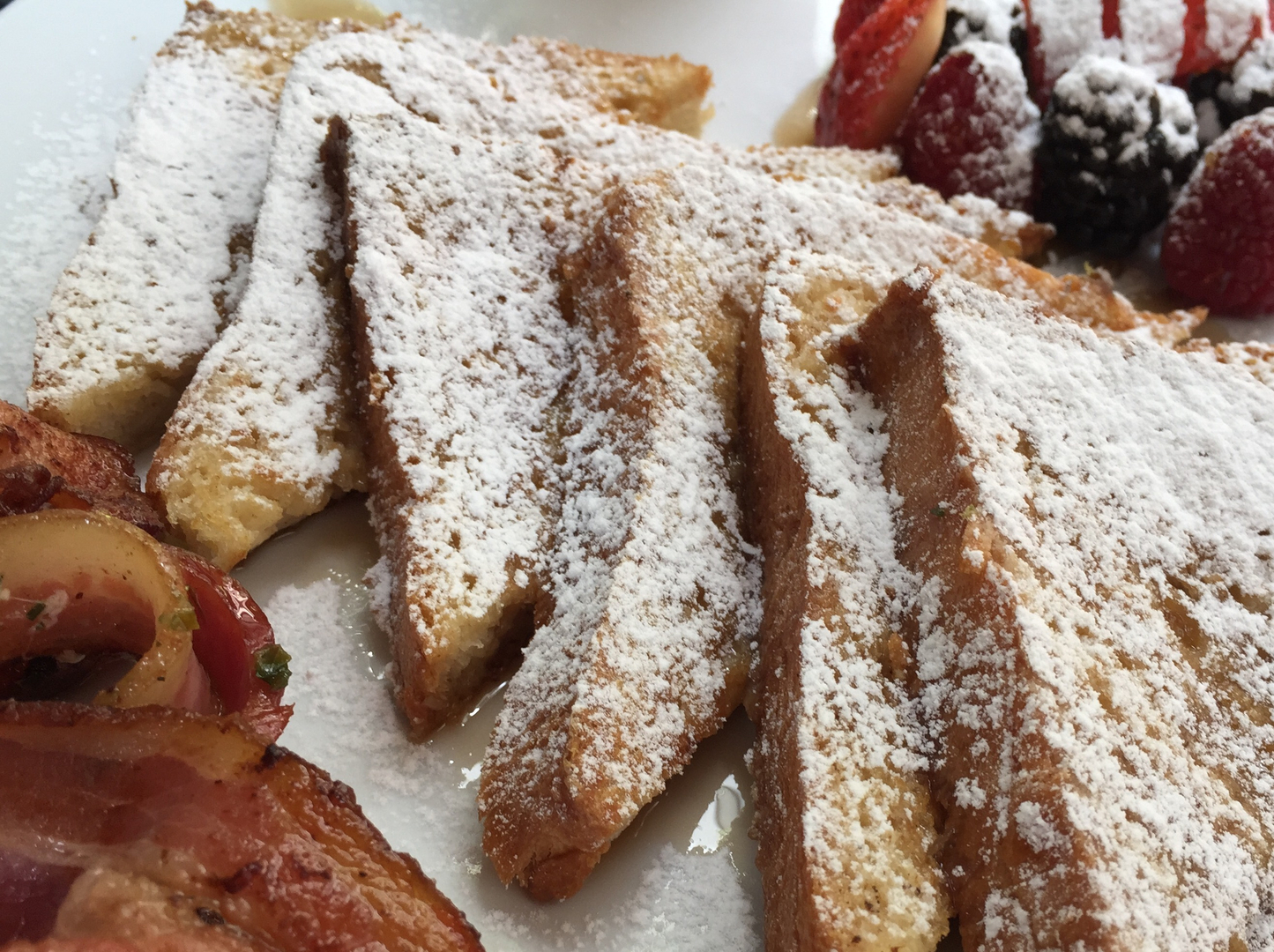 Rebanadas de pan de caja artesanal, cubierto de una mezcla de huevo, leche, vainilla y canela, espolvoreados con azúcar glass y bañados en miel de maple natural.