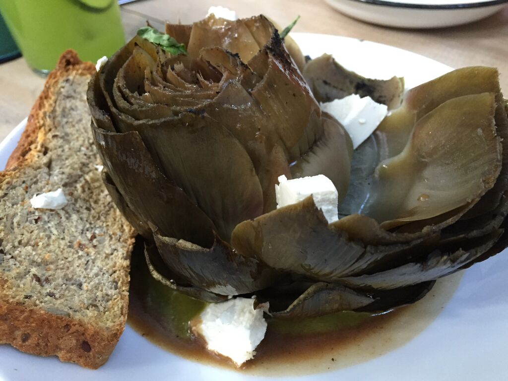 Alcachofa al grill con queso de cabra, bañada con aderezos de orégano, cilantro y chipotle.