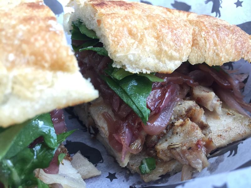 Porchetta, cebolla caramelizada, arugula y mayonesa de ajo rostizado, se va a volver un clásico.