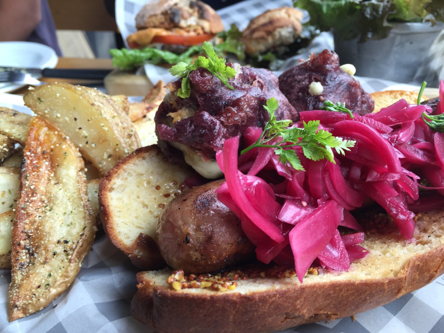 Hot dog con salchicha receta de la casa, cebolla morada, perlas de queso oaxaca y maíz azúl.