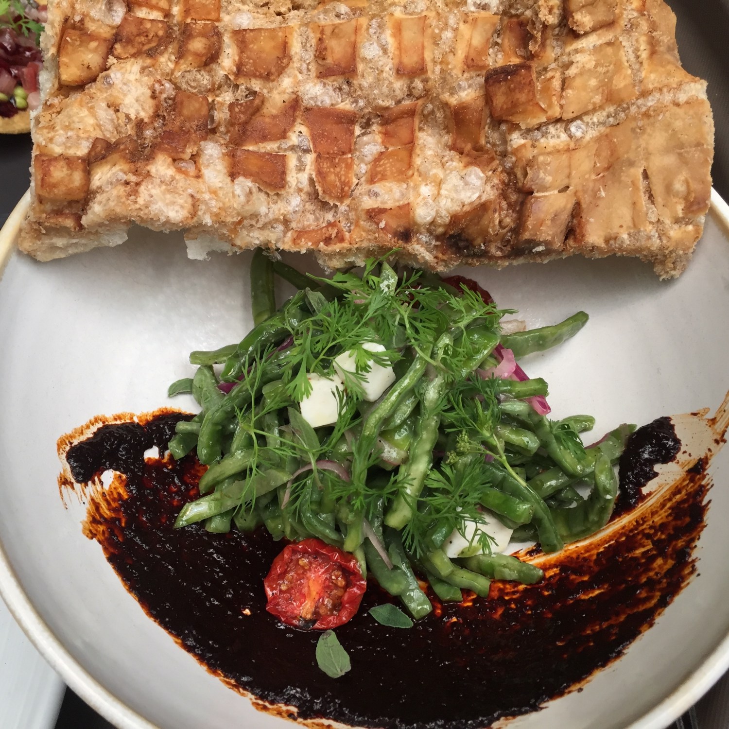 Ensalada de nopal curado, eneldo, queso panela de cabra, aguacate, pasta de chiles y chicharrón grueso, una forma muy ligera de empezar la comida.