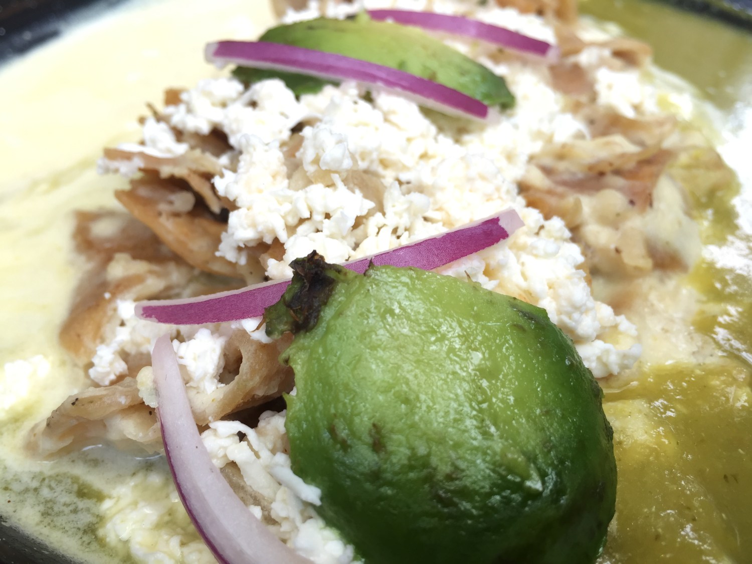 Chilaquiles bañados en salsa de queso menonita, gouda y requesón, con un poco de salsa verde y aguacate, para hacer agua la boca.
