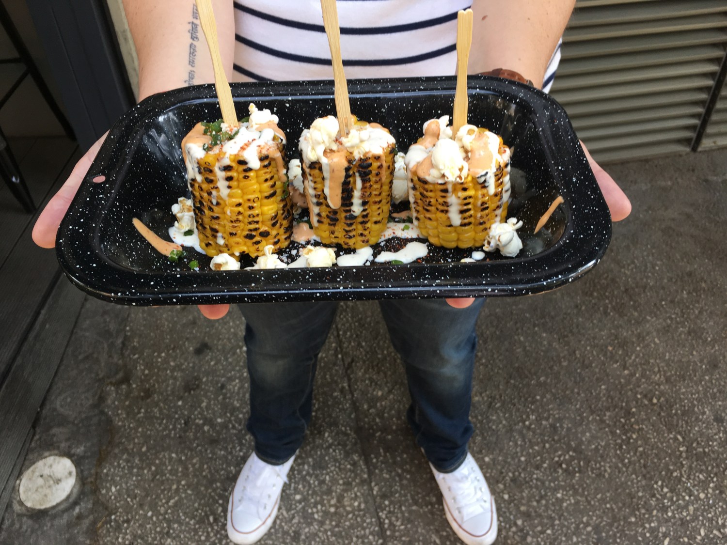 paletas de elote amarillo rostizado con salsa blanca, queso fresco, cilantro, chile en polvo y palomitas.