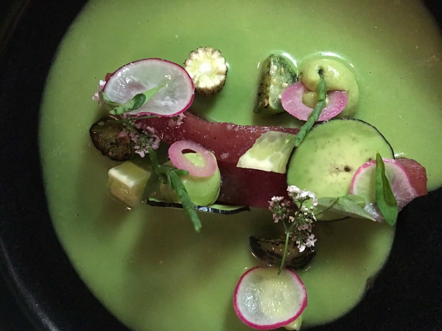Pesto de hoja santa, rábano y caldo de mastuerzo, una ensalada que no te vas a querer perder.