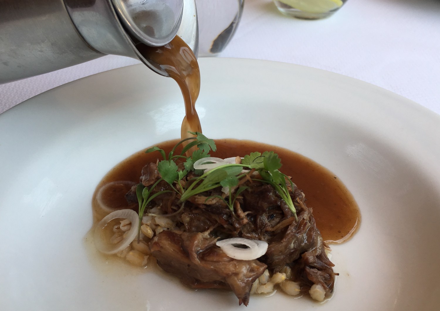 Caldo de rabo de buey cocinado a baja temperatura, cebada perla y oporto, la mezcla de sabores perfecta hecho despacito para llenar todos tus sentidos.
