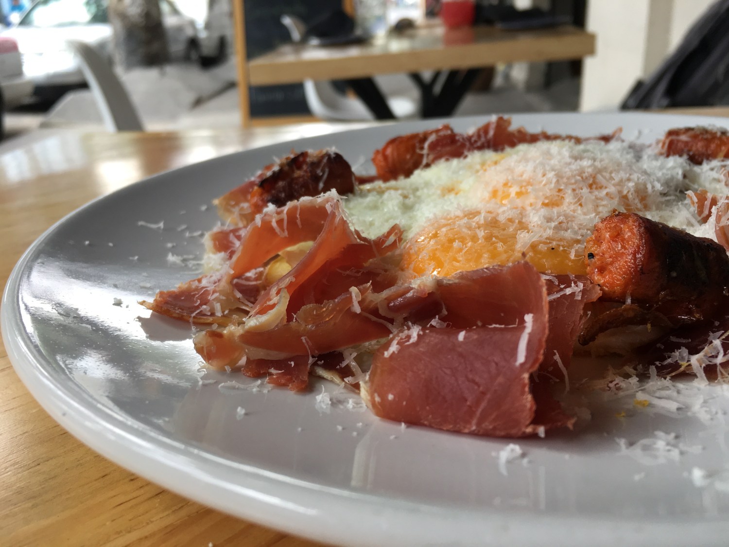 Un par de huevos rotos, acompañados de chistorra y jamón serrano, con un toque de queso parmesano, la mejor forma de empezar la mañana.