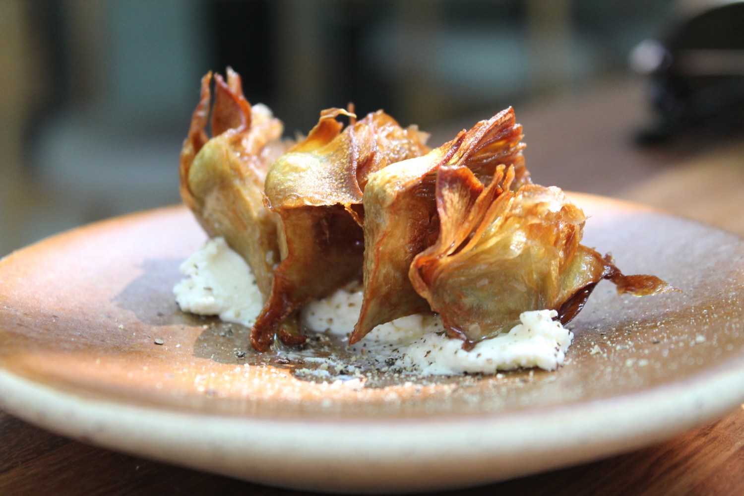 El restaurante es luminoso, íntimo y con una terraza que parece que estas en una casa en el árbol rodeado de las acogedoras ramas de los viejos de la colonia. La barra cuenta con un par de pequeñas mesas, aquí puedes pedir vinos por copeo, cócteles de la casa y botanas bastante gourmet como las alcachofas con yogurt y las almejas chocolatas en escabeche.