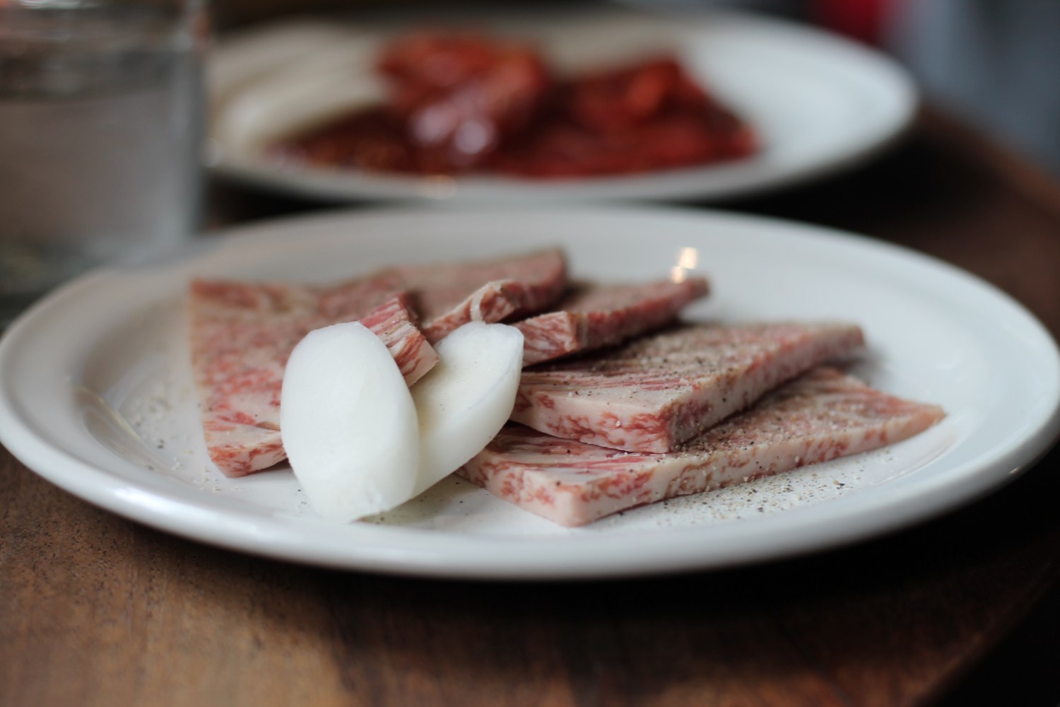Una secuencia de platos llenos de comida cruda van llegando a la mesa para que tu mismo los prepares a tu gusto en el asador. Empezamos con un plato de verduras como cebolla, espárragos, col y otras verduras de origen japonés (vienen con unas bolitas de mochi que sabe delicioso a la plancha), seguido por lengua de res, short rib, costilla, arrachera, pollo, panceta de cerdo, arroz con huevo orgánico y nori, un espectacular ramen coreano hecho a base de caldo de res con wagyu.